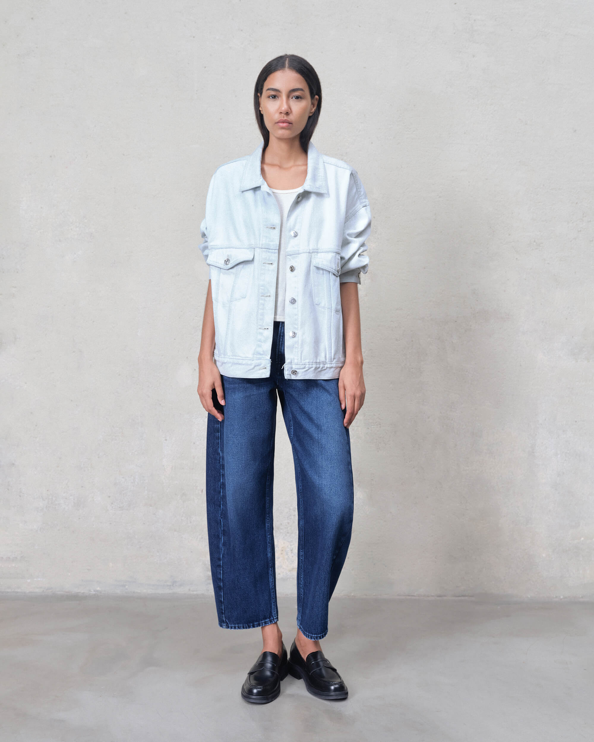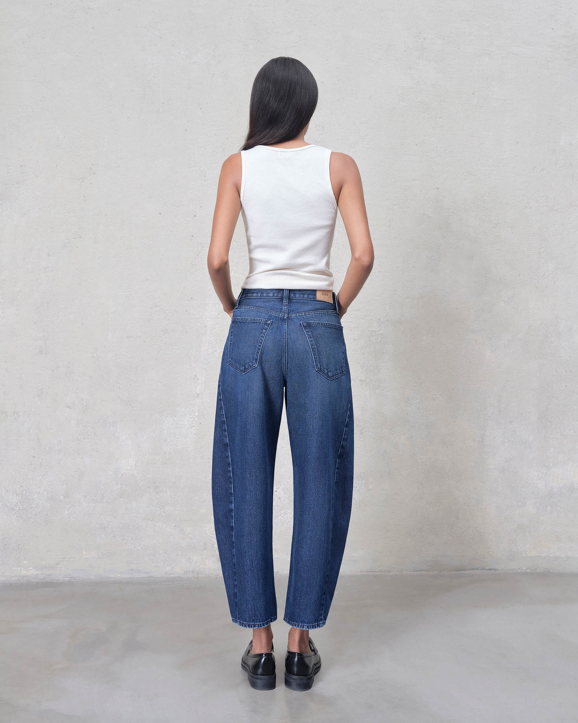 The silhouette that speaks without saying a word. Crafted in two-tone denim with natural whisker and fade details, this barrel shape creates airy leg room while thoughtful insert details bring effortless movement and understated edge.
