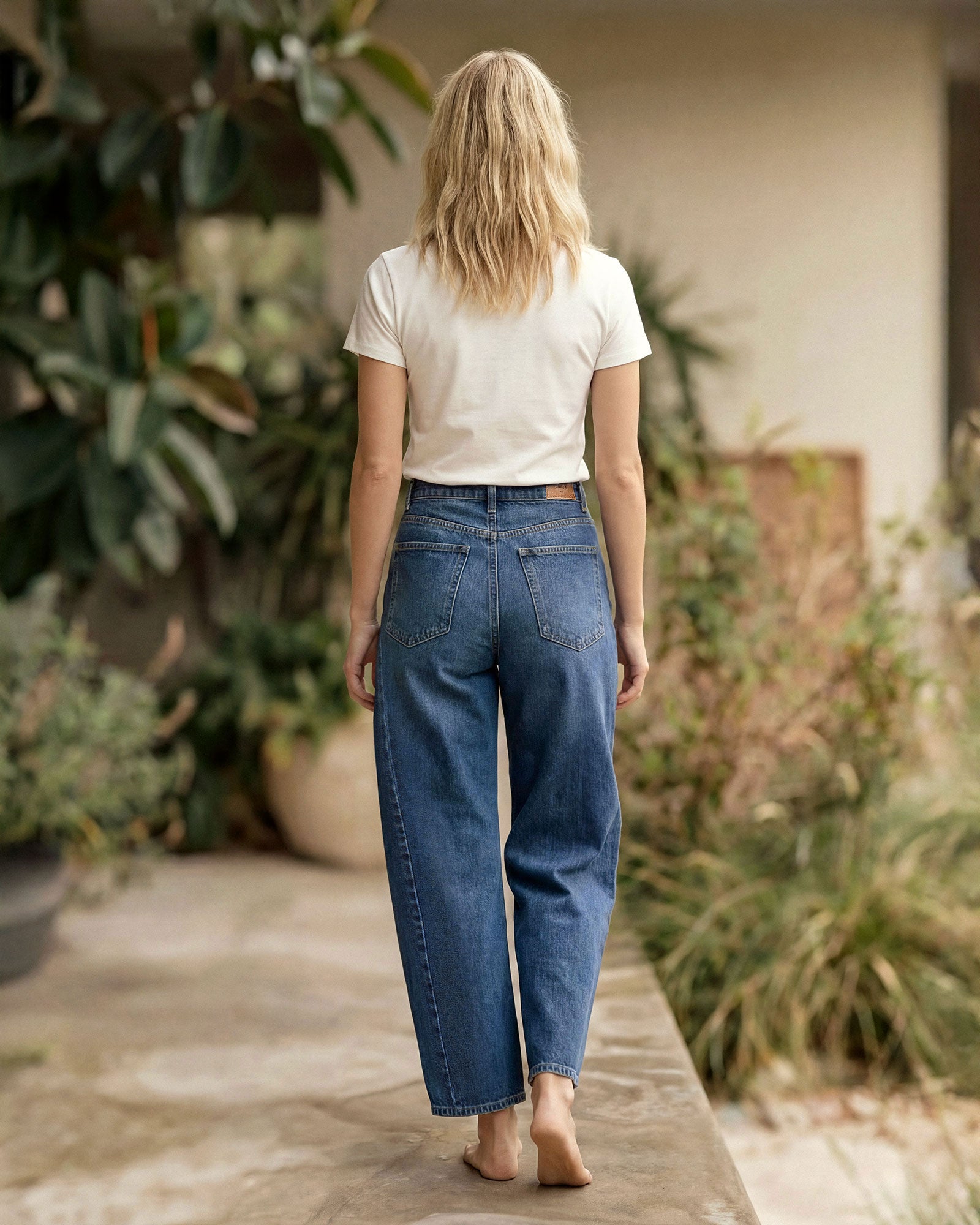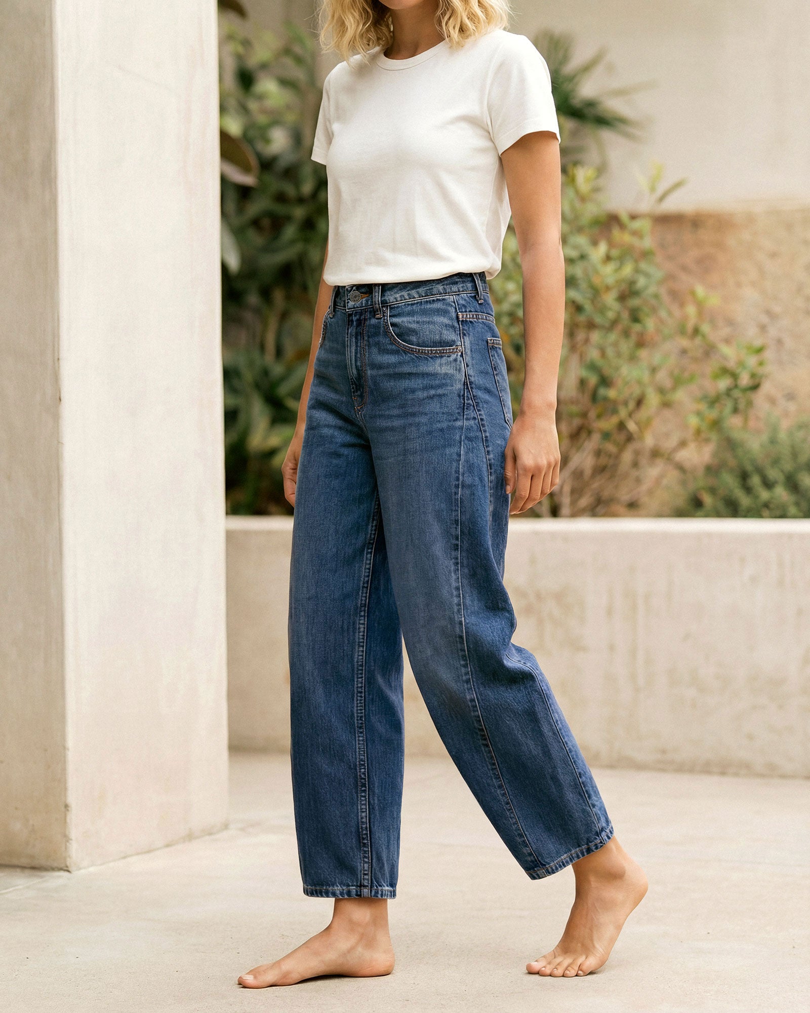 Barrel silhouette in softly faded denim.