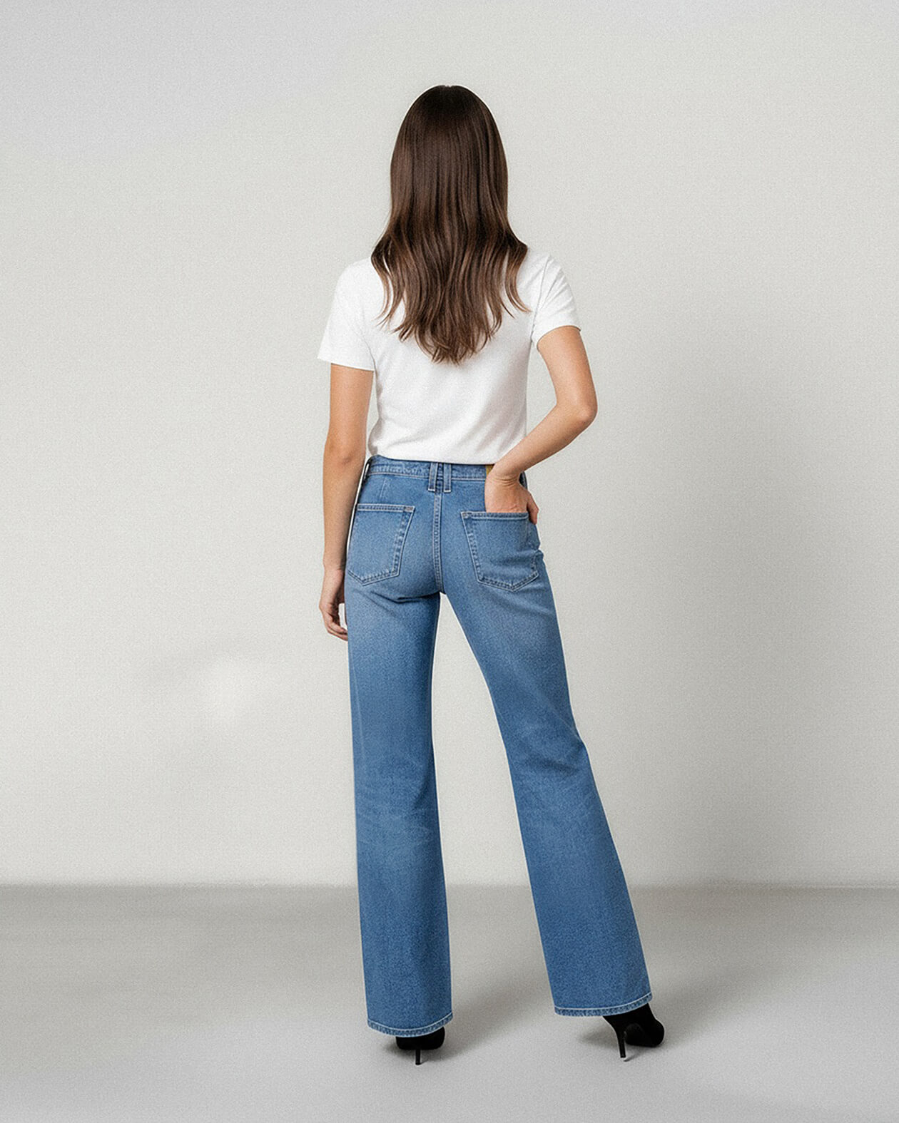 Cut in Hennesy, a rich, warm wash that carries subtle depth, the mid-high rise sits comfortably at the waist before releasing into a floor-skimming wide leg. Crafted from soft ribbed cotton with a broken-in feel, it balances volume and grace in every step.