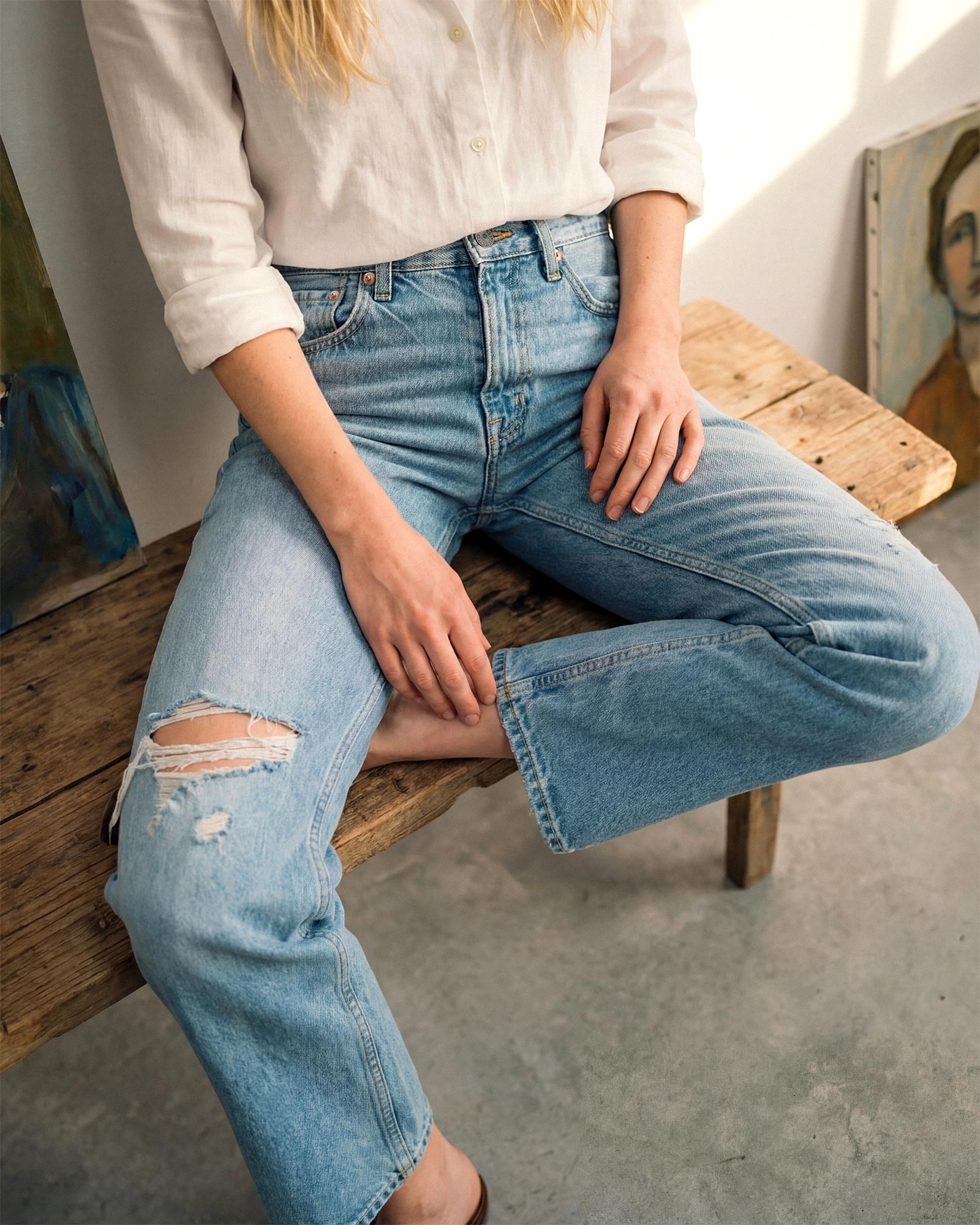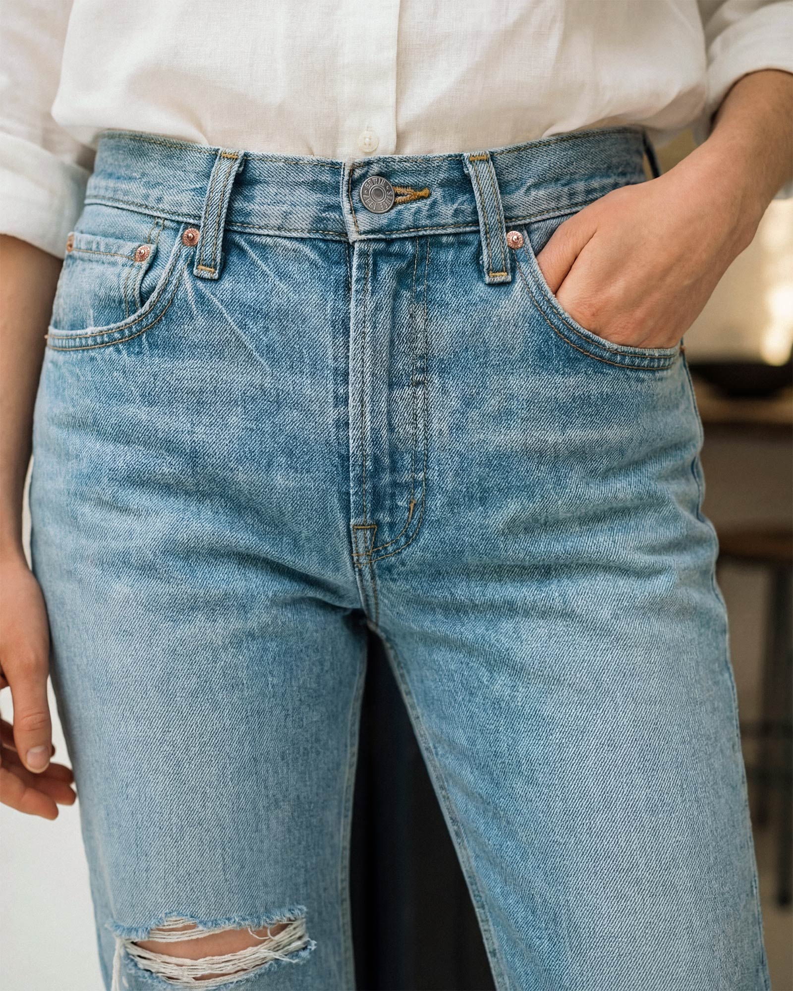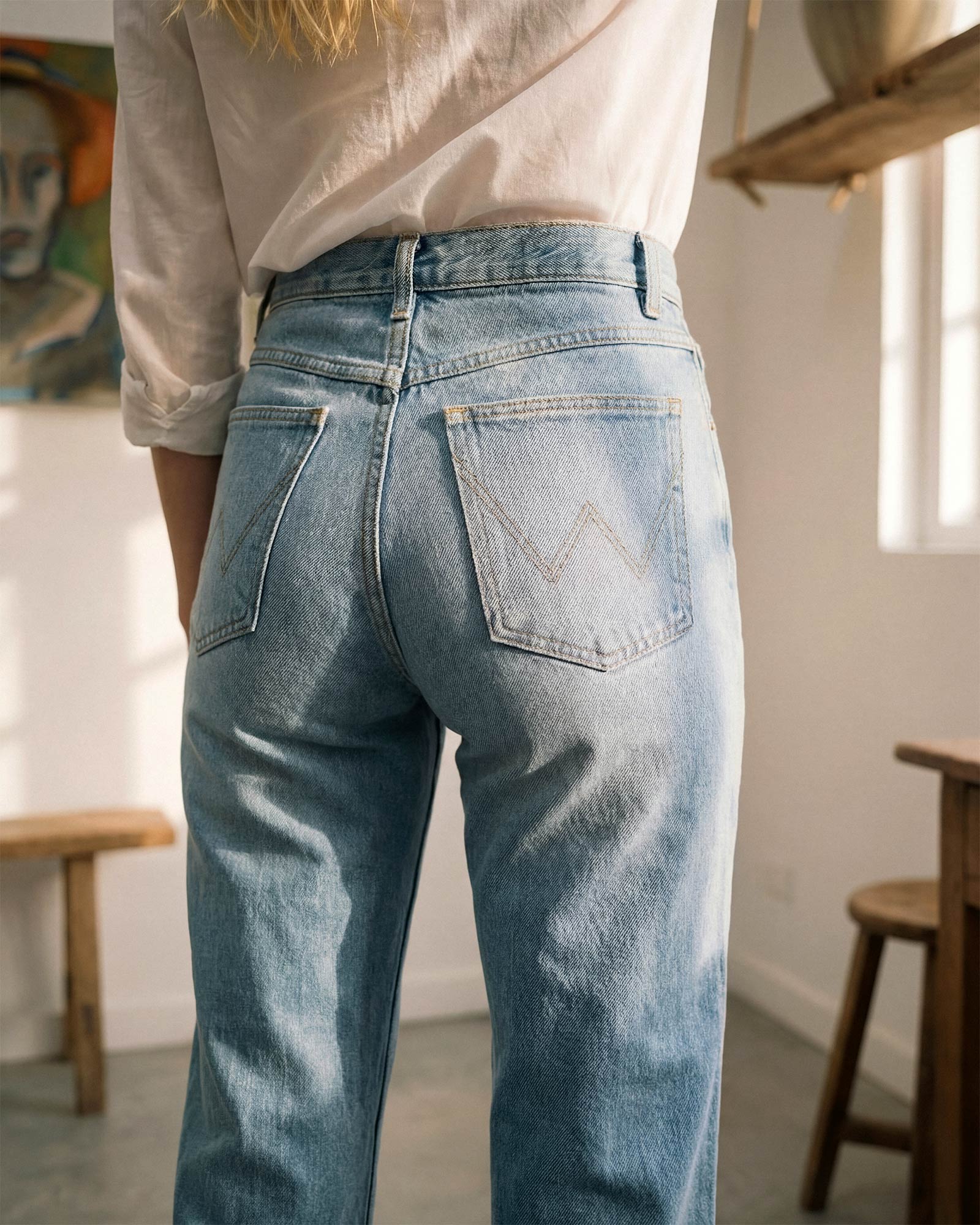 Ankle length bootcut with a mid-rise in medium blue vintage wash.