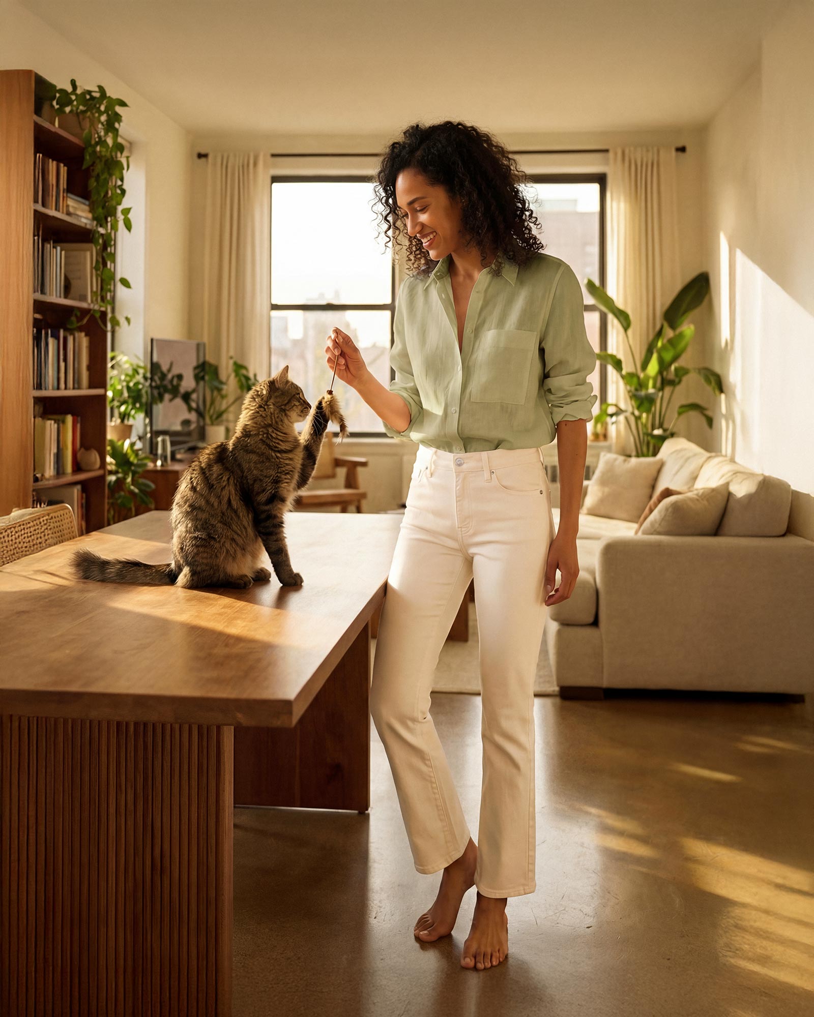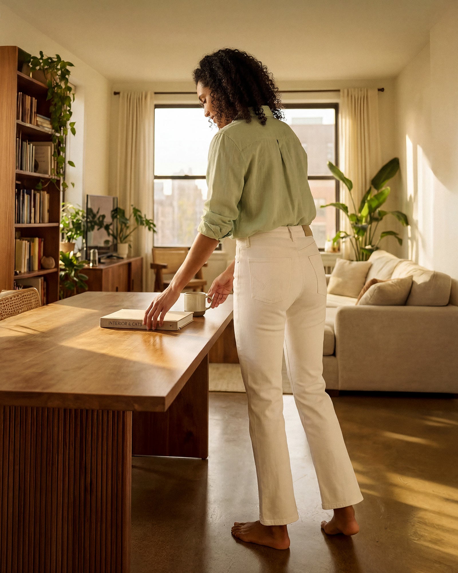 Cropped at the ankle with a flare, it opens at the knee and keeps proportions clean through the leg.