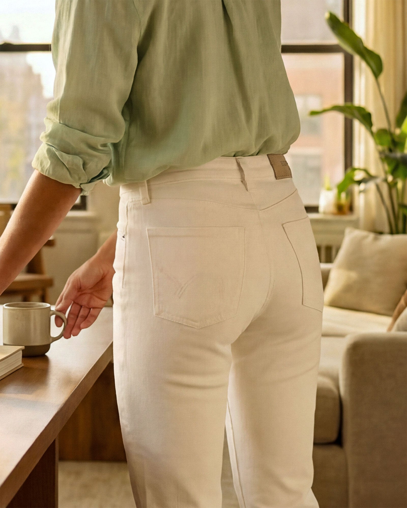 Ankle length bootcut with a mid-rise in soft white denim wash.