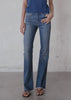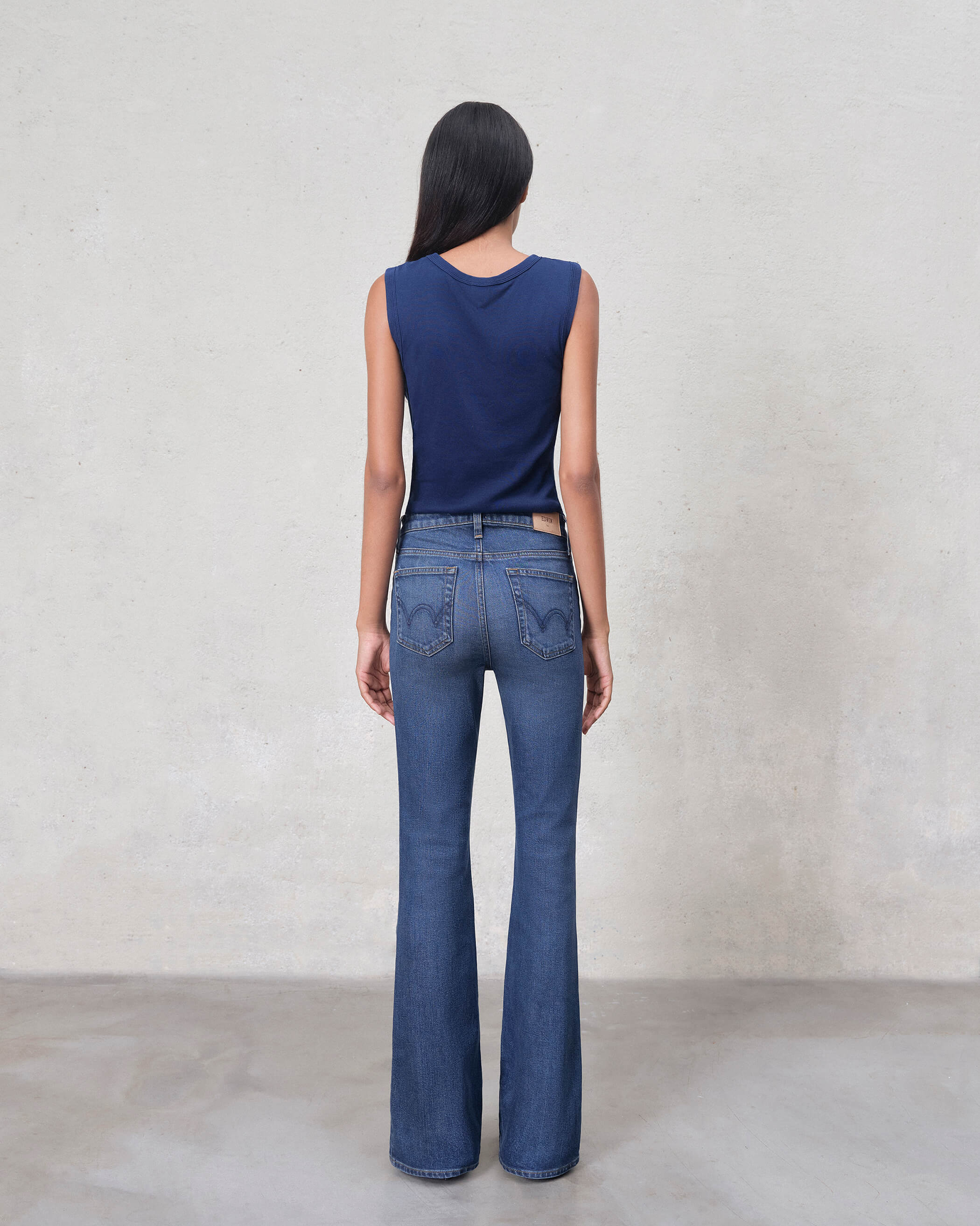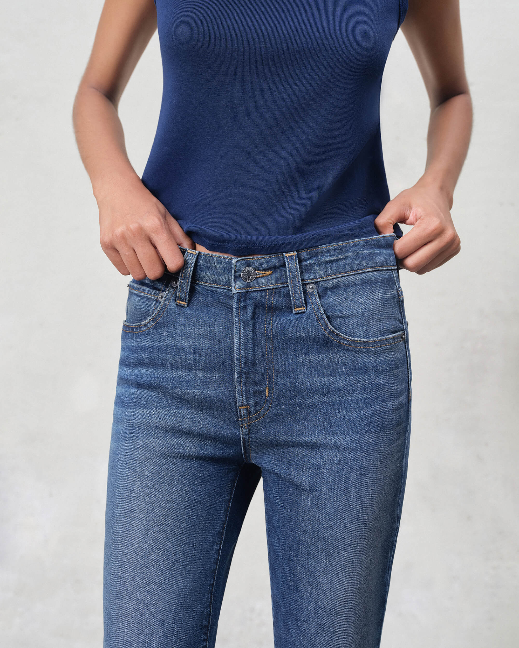 With soft structure, subtle sheen, and light fading, the Lark hugs from hip to knee before opening into a gentle flare with classic length. The mid-high rise sits comfortably, with just enough stretch for ease.