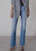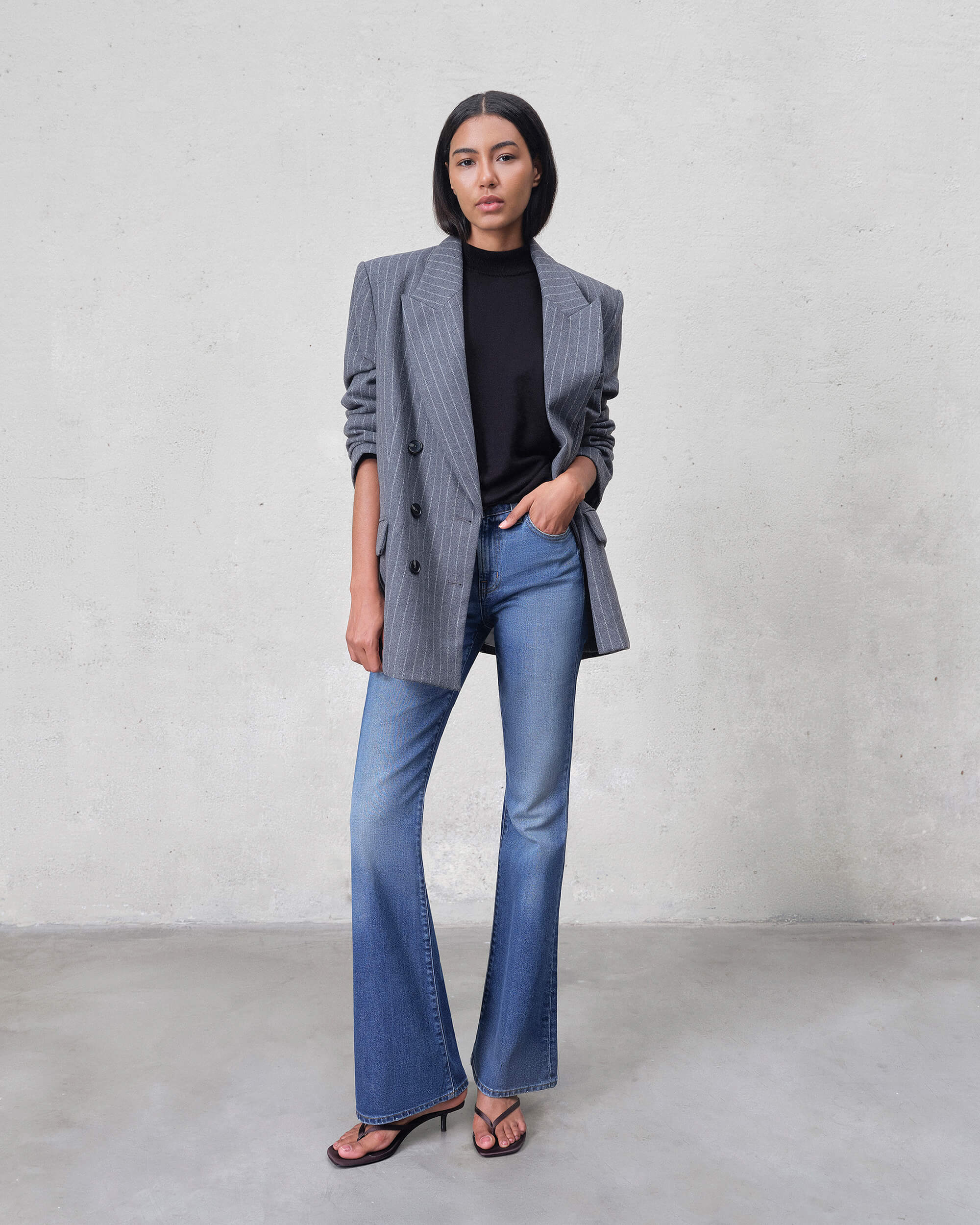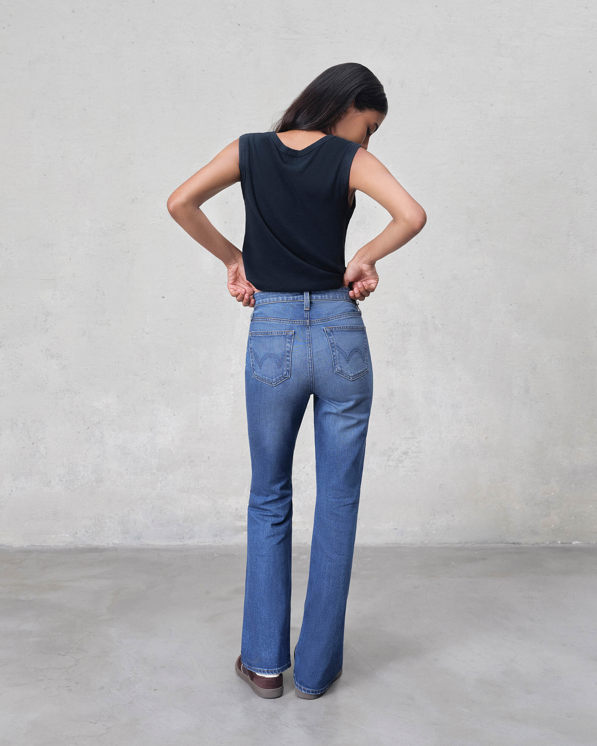 Soft yet structured, it holds close through the hips before easing into a quiet flare. Light fading adds dimension to the classic coated wash. Mid-high rise, easy stretch—comfortable all day.