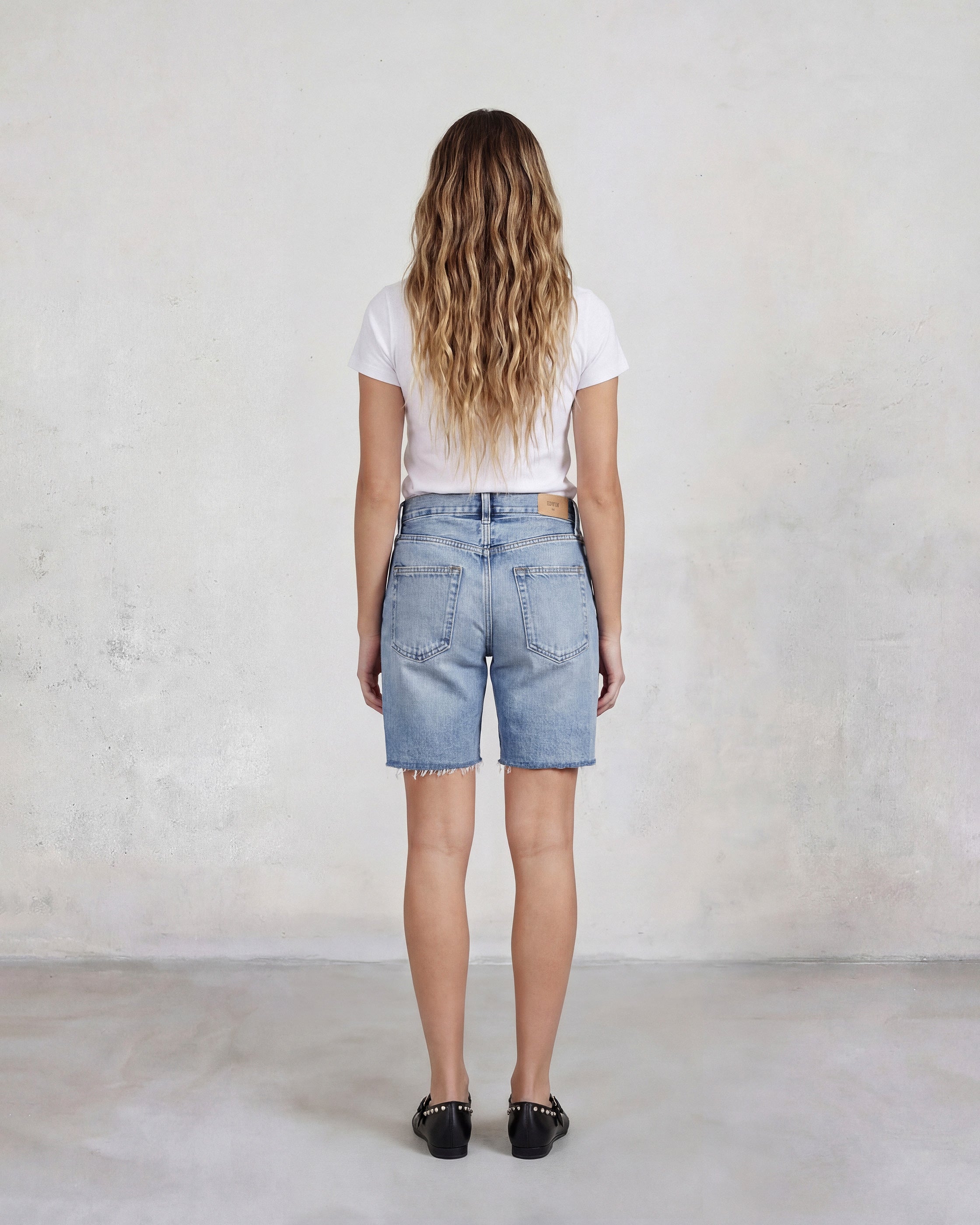 Plaza carries the ease of something already broken in. Light blue that breathes. Raw hem left unfinished, softens as you move. Sits high, falls just above the knee.