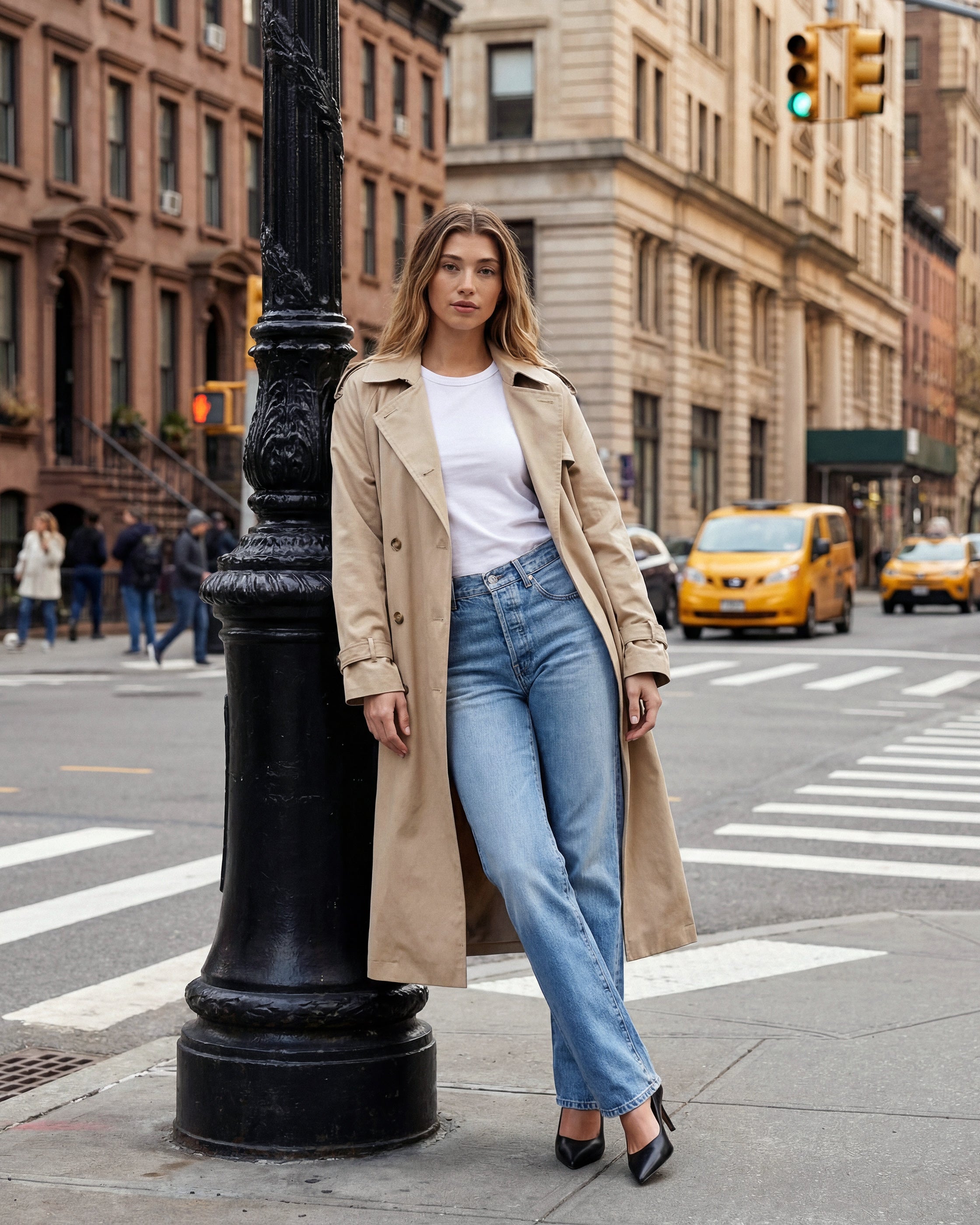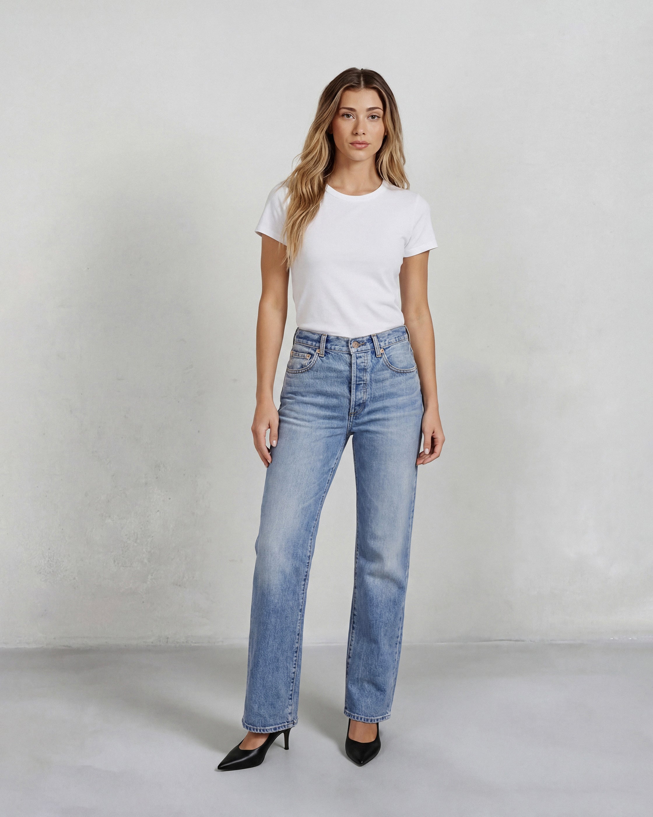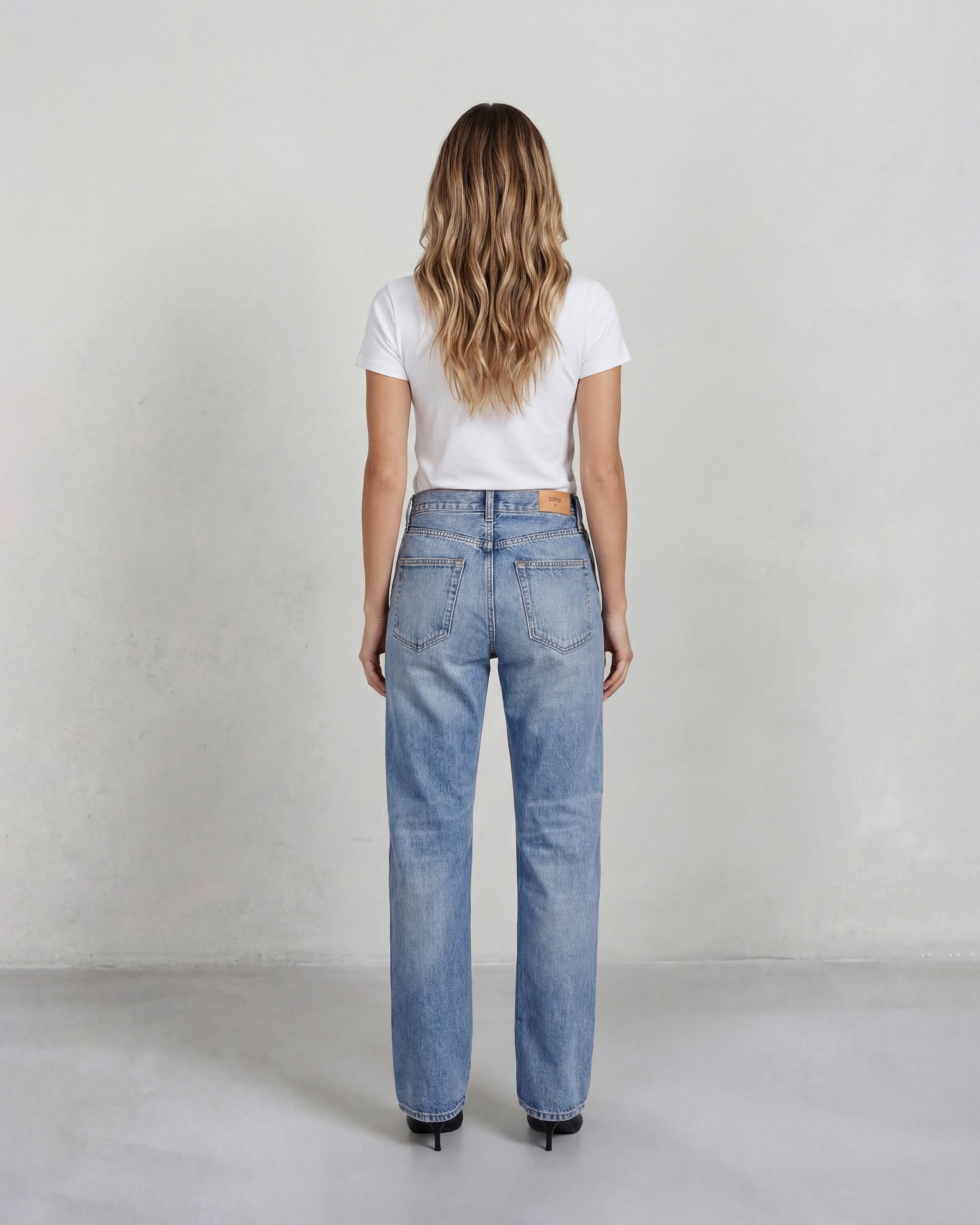 Solano feels sun-faded, already lived-in. Light blue that softens with time, not flash. Relaxed through the hip, straight down the leg. Sits high enough to hold, loose enough to move.